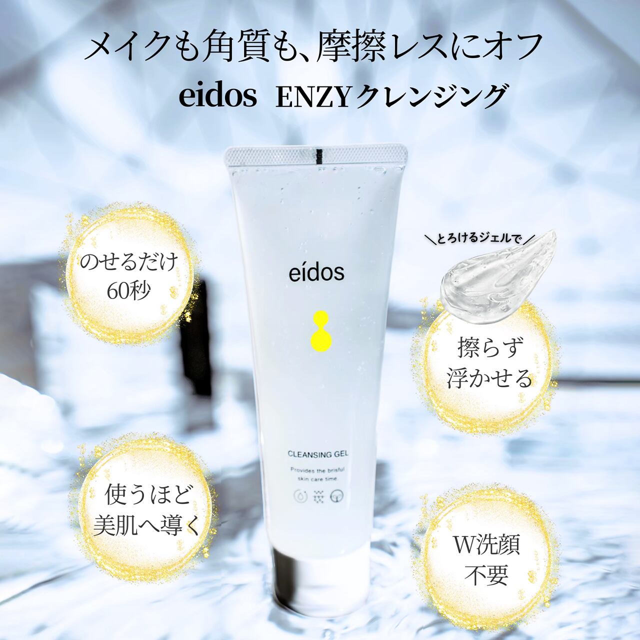eidos ENZYクレンジングは、摩擦レスでとろけるイオン化ジェルを使用し、浮かせて落とす新感覚のクレンジングです。クレンジングと同時に毛穴ケアも可能で、気になる毛穴の開きやたるみ、くすみに働きかけます。