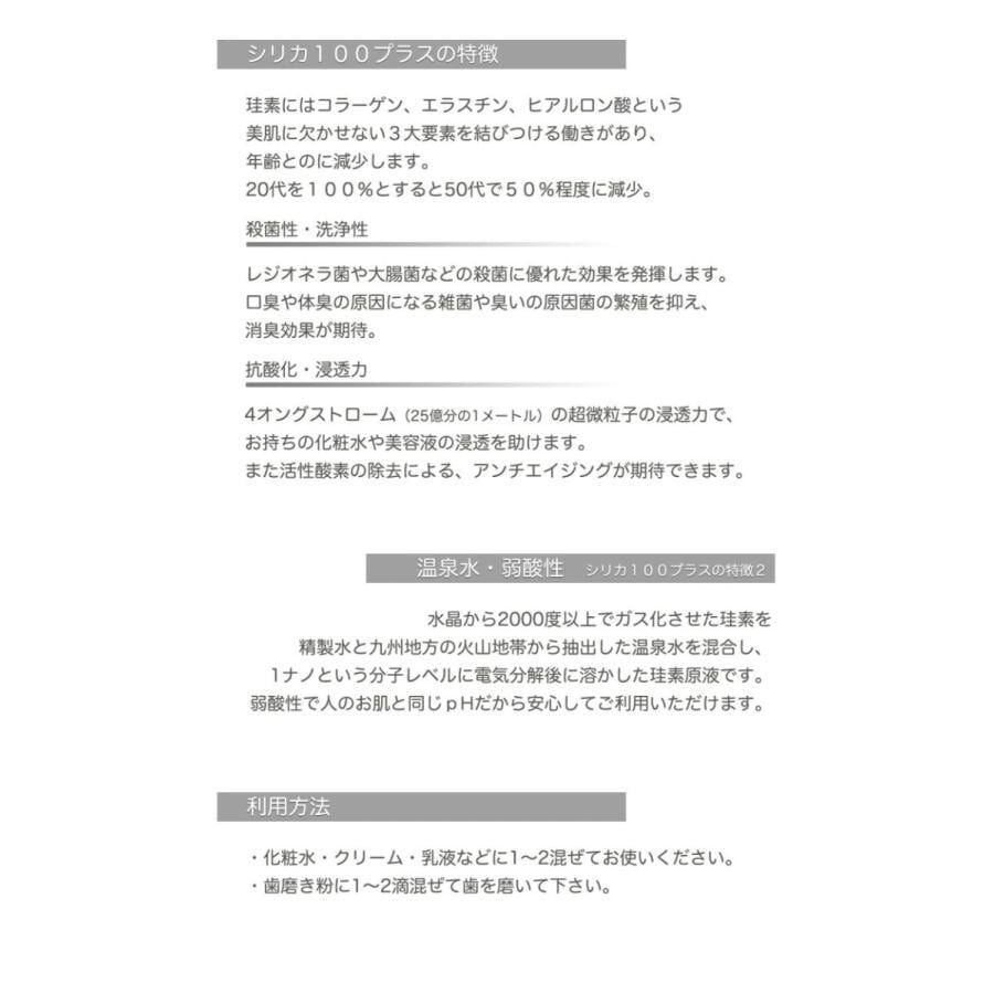 ☆珪素原液☆ケイ素は地球上で酸素に次いで多く存在する元素のことです。美肌に必要なだけではなく、骨やリンパ節、歯、筋肉など人体を構成する大切な成分のひとつです。ケイ素にはコラーゲン、エラスチン、ヒアルロン酸という美肌に欠かせない3大要素を結びつける働きがあります。水晶から2000度以上でガス化させた珪素を精製水と九州地方の火山地帯から抽出した温泉水を混合し、1ナノという分子レベルに電気分解後に溶かした珪素原液です。弱酸性で人のお肌と同じです。